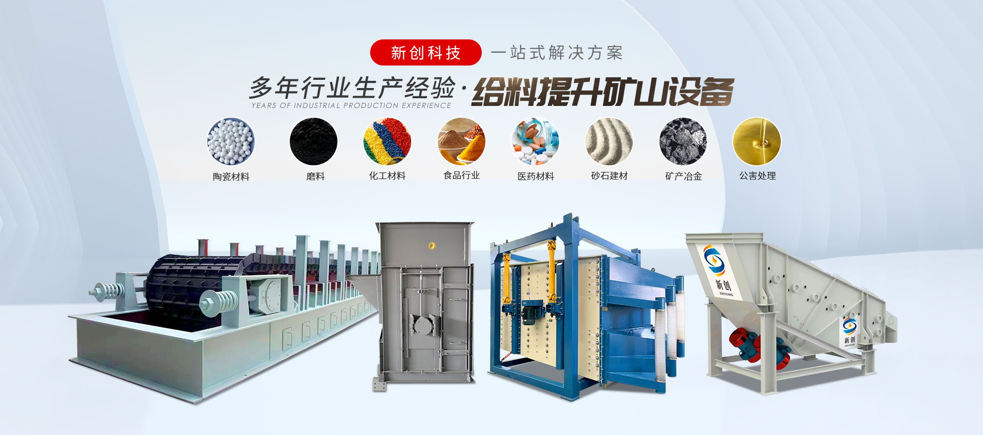 邯鄲市峰峰礦區新創(chuàng)科技有限公司是振動設備、給料設備、振動篩分設備、輸送設備、提升設備、除塵設備等制造廠,玻璃原料輔機生產廠。
